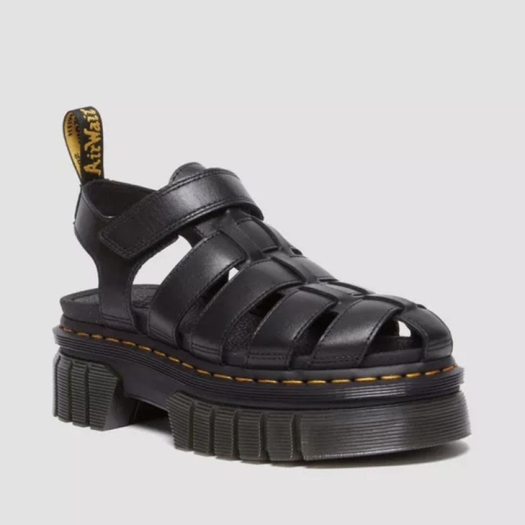 SHOES Dr.Martens Ricki Nappa Lux Leather 3- Strap Platform Sandals 27405001 Next-generation sandals. The Ricki 3 strap sits atop our two-part Quad Neoteric platform - a radical reinterpretation of our iconic Quad sole, featuring a lightweight two-part construction, deep shoe, and exaggerated side panels. Crafted from wearable Lux Nappa leather, the sandals are accented with our signature black and gold heel ring and gold stitching. Each pair is fitted with a molded, antimicrobial cork footbed to keep feet fresh all summer long. PRODUCT CODE: 27405001