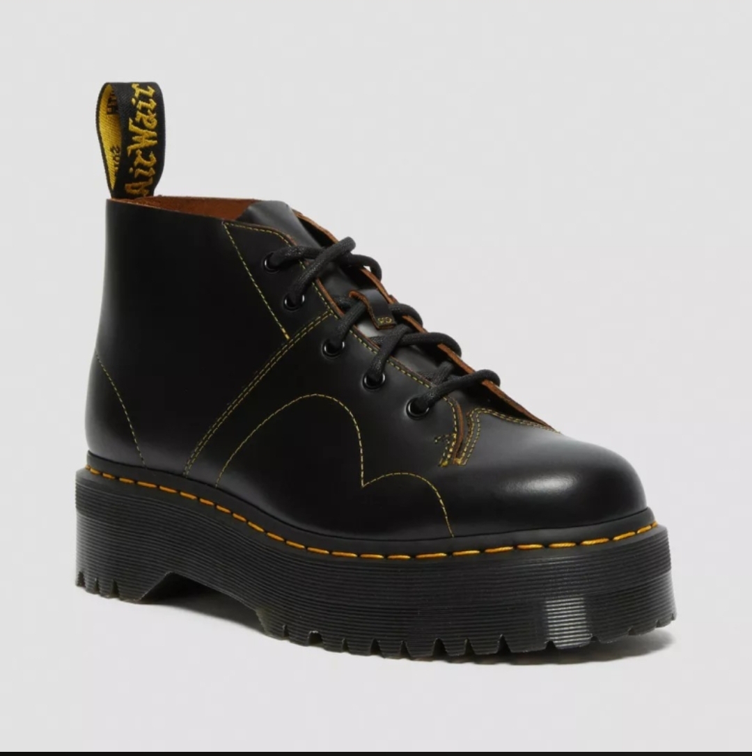 Sleek, slim silhouette with low laces, this is the classic Monkey shoe style with all the typical Docs cues. Our Church Quad shoes have been revamped with a premium, high-strength sole - take a favorite classic shoe and stack it up with added Docs attitude. We created this product exclusively for our website. You won't find it anywhere else Vintage Smooth is a retro version of our signature Smooth leather with a subtle grain effect and contrasting base color. Clean with a cloth and care with a Dr. Martens shoe polisher. Our Goodyear weft seams are heat-sealed at 700°C and reinforced with our signature stitching. 1.5" platform Built with the core DNA of Dr. Martens: grooved edges, AirWair heel loop, and visible stitching PRODUCT CODE: 25357001