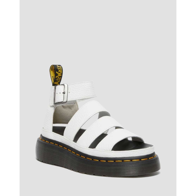 The Clarissa II Quad is the classic gladiator sandal we've always made — with three straps, an adjustable ankle buckle, and all the Docs DNA. But now, it's been boosted in strength and looks even more powerful thanks to its extra-high platform sole. Gladiator-style sandals Adjustable ankle strap Crafted with classic Docs DNA, featuring grooved edges, a heel loop, and visible stitching. Made from Milled Nappa leather, a soft, supple type of pebble leather. Built on the iconic and comfortable Dr. Martens air-cushioned sole. Designed to last a long time with durable Goodyear webbing. Base height: 1.46'' Upper material: 100% leather Inside: 100% Leather Base: 100% PVC MATERIAL Milled Nappa leather is a type of stiff pebble leather that offers a soft and supple feel from the very first wear. STORAGE INSTRUCTIONS Wipe away dirt and dust with a damp cloth. Use a neutral-colored or color-matching wax-based shoe polish. CONSTRUCTION Goodyear Welted - the upper and sole are heat-welded and stitched together, providing greater comfort and durability for years to come.