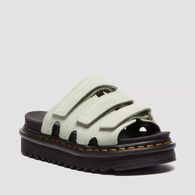 New Raine Slide sandals combine an easy-to-use on/off slider with a lightweight Zebrilus EVA insole and a comfortable SoftWair footbed. The upper features 3 adjustable Ripstop straps to help you find the perfect fit. The sole is grooved and secured with DM yellow stitching.