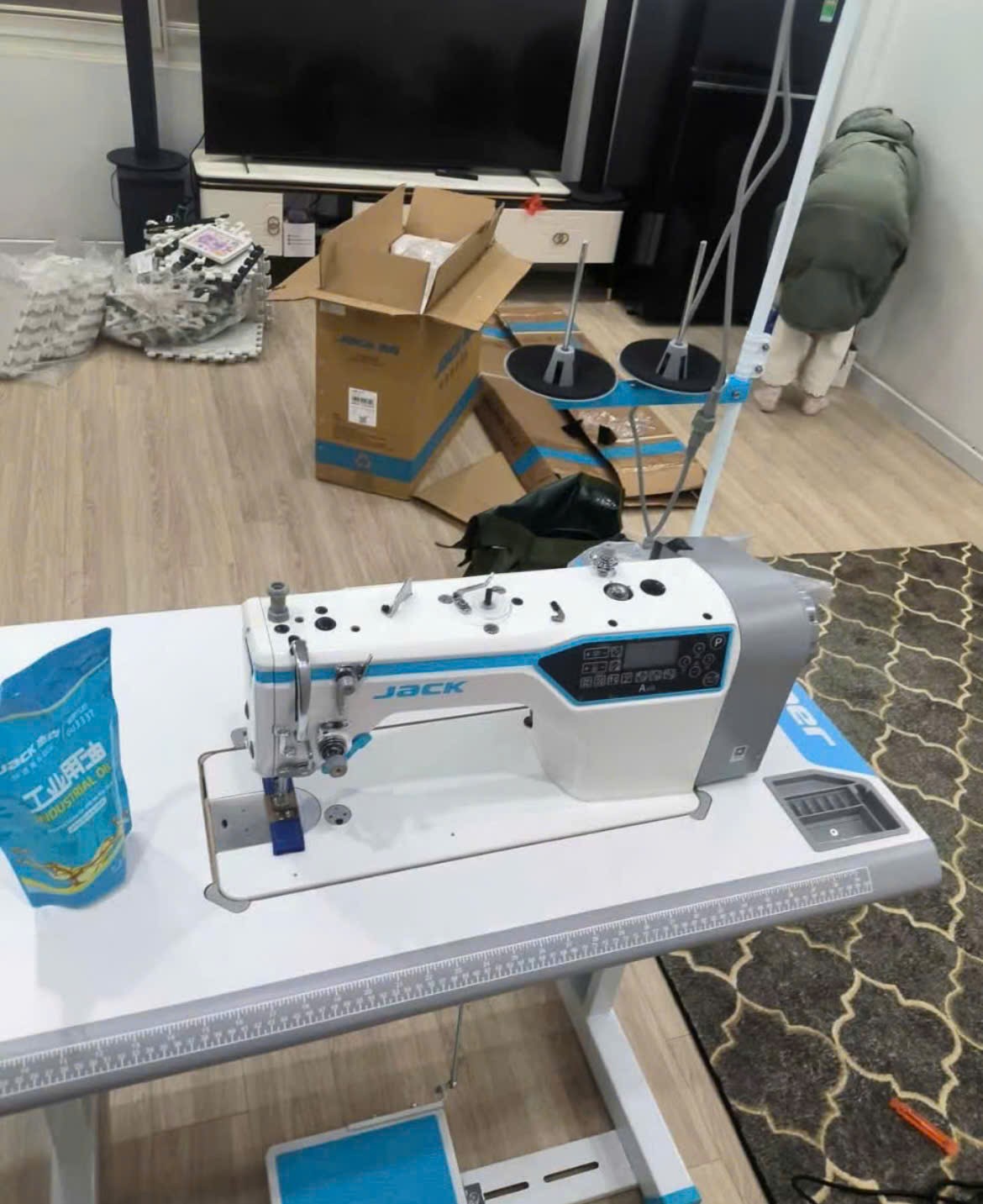 Jack A4-A-C electronic single-needle sewing machine. Comes with 10 bobbins and a pack of 10 needles. 100% brand new. It features a digital control panel for setting stitch length and adjusting settings. The machine includes automatic functions such as thread trimming, reverse sewing, and a foot lifter. It is designed for quiet operation with reduced noise from the bartack mechanism. The stitch length can be adjusted with high precision, up to 0.1mm, controlled by a stepper motor. Key Specifications for Model A4B-A-C: Weight: 40 kg net / 46 kg gross. Dimensions: Approximately 690 x 295 x 550 mm. Max Sewing Speed: 5,000 stitches per minute. Features: This model is a single-needle computerized lockstitch machine featuring an energy-saving direct-drive motor, automatic thread trimming, and an electronic stitch length control system