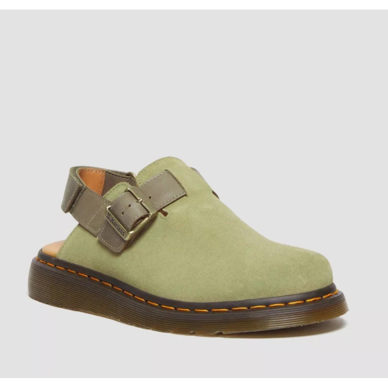 Product information: Perfect for the summer months. Designed to go further. Our iconic mule returns in timeless EH Suede, a soft, textured leather reinforced with DM's signature durability. Our warm-weather slip-on shoes feature a seasonal color palette and are secured with contrasting heel tape and a buckle front strap. Finished with antique gold hardware and our classic gold stitching. Fixed on our easy-to-ride Shore sole. EH Suede is a classic suede with a smooth, enhanced texture. Carrara is a natural, untreated leather that develops unique characteristics and patina over time. Construction - Made with our Goodyear welded wire, hermetically sealed at 700ËšC and reinforced with our signature stitching. Sole height - Sole height: 1 inch Heel height: 1 1/2 inches Foot insoles - Thinner and tapered toe shape Fit Note - Due to the adjustable back strap, we recommend sizing up. MATERIAL EHSuede + Carrara - a classic suede with a smooth, enhanced texture combined with our new Carrara leather, an untreated natural leather that will develop unique characteristics and patina over time.