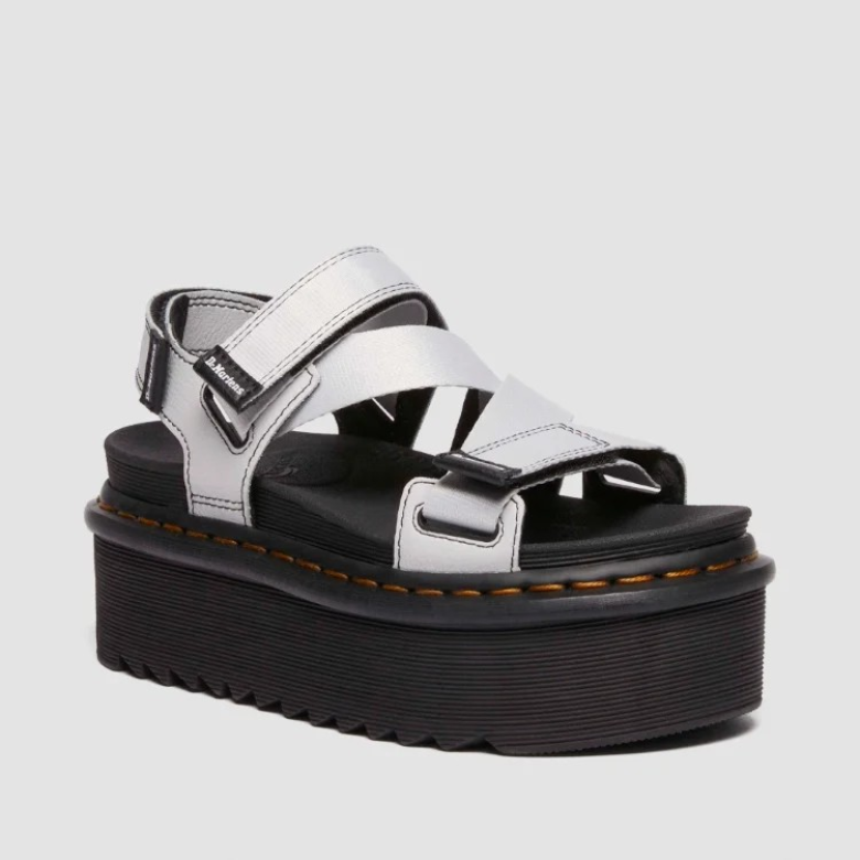 The Docs DNA is broken in. These brand-new sandals are equipped with the AirWair 'with Bouncing Soles' tagline. A modern remake of a classic Docs sandal, this towering silhouette is constructed from Hydro leather with AirWair-branded ripstraps. Finished with yellow stitching and a contrasting Gunmetal design. Our SoftWair memory foam footbed ensures comfort from the very first step. Hydro is a smooth PU-coated leather with a matte finish. Clean by wiping with a damp cloth. 3 adjustable ripstraps . Top: 42% Leather / 58% Textile Inside: 100% PU Shoe sole: 100% EVA