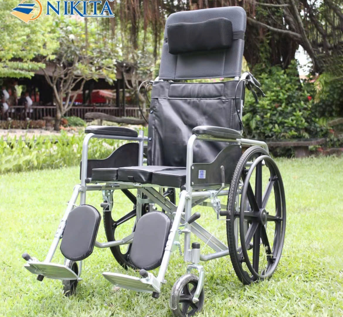 Manual wheelchair with reclining bed, piston mechanism, foldable, with commode and padded seat N216-3PTX - Genuine Nikita product. Foldable. Includes toilet seat. Foldable. Key Specifications Net Weight: 21 kg Maximum Load Capacity: 120 kg Frame Material: High-carbon steel with a rust-proof coating Primary Features: Includes a hydraulic piston system for reclining (90° to 180°), an integrated portable commode, and a 4-point braking system. This multi-functional model is designed for the elderly or patients, combining a walking aid, wheelchair, and commode into one unit. It features a breathable canvas cushion and a neck pillow for added comfort.