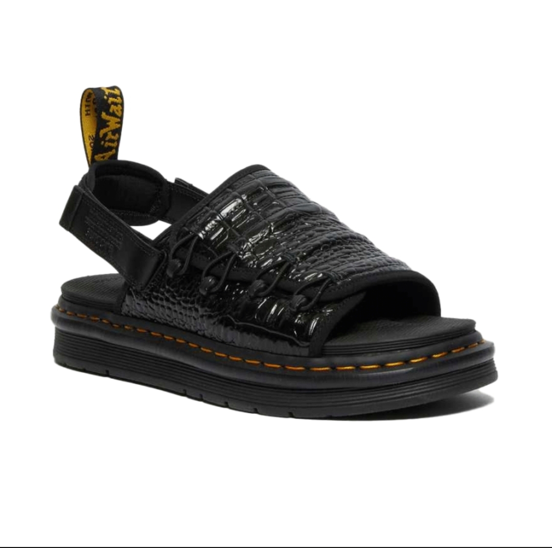 Honor the uniqueness. DM Mura embodies the innovative design philosophy of our two brands. The combination of Suioke's Mura model and our Lorsan outsole, with this out-of-the-world foot combines the contours of the DR. Martens and Suicoke. They are available in smooth black leather or Vibrance Croco black leather, a novelty, with a synthetic rubber upper on both models. They are embossed with the Dr. Martens and Suicoke, and there are hooks and closure hooks and velcro straps at the heel. For details: yellow stitching, black and yellow heel tab with door signature both brands. The new Croco Vibrance leather is a high-gloss material embossed with a crocodile scale pattern. Our Goodyear-Weted tabs are heat-sealed at 700°C and reinforced with characteristic stitching